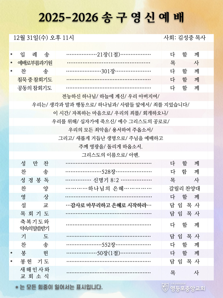251231 송구영신예배 순서 및 소식