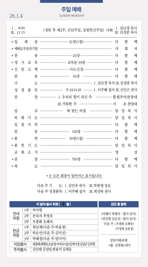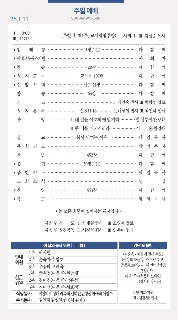 260111 주일예배 순서 및 소식