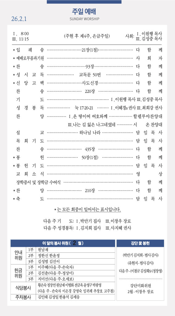 260208 주일예배 순서 및 소식