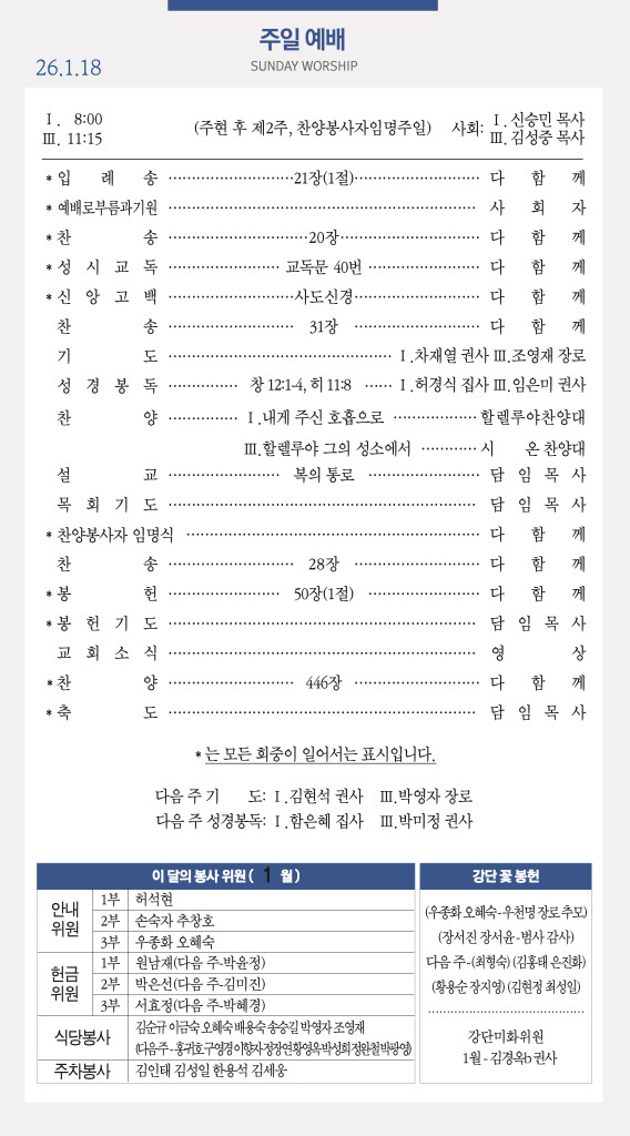260118 주일예배 순서 및 소식