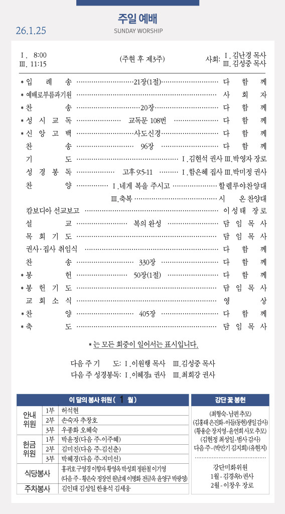 260125 주일예배 순서 및 소식