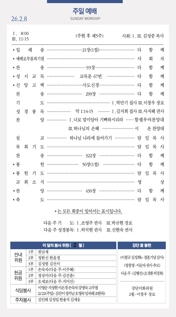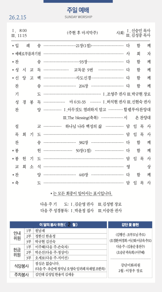 260215 주일예배 순서 및 소식
